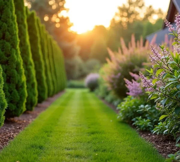 Les haies constituent l’option la plus pérenne pour délimiter et isoler visuellement votre terrain. Pour une haie dense, plantez vos arbustes à une distance équivalente à la moitié de leur largeur mature. Par exemple, des cèdres qui atteindront 1,2 m de large doivent être plantés à 60 cm d’intervalle. Les thuyas (cèdres), l’if du Canada ou les épinettes sont des choix classiques, mais envisagez aussi la haie libre composée de plusieurs espèces (spirées, viornes, physocarpes) qui offre une biodiversité accrue et un intérêt visuel sur quatre saisons.